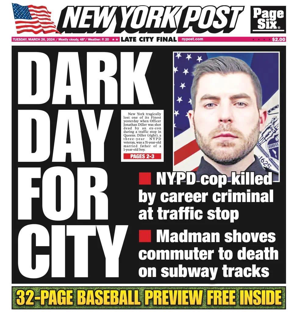 2024年,《纽约邮报》头版以“城市的昏黑一天”为题,刊登乔纳森·迪勒警官像片