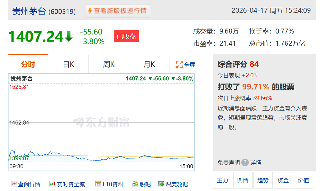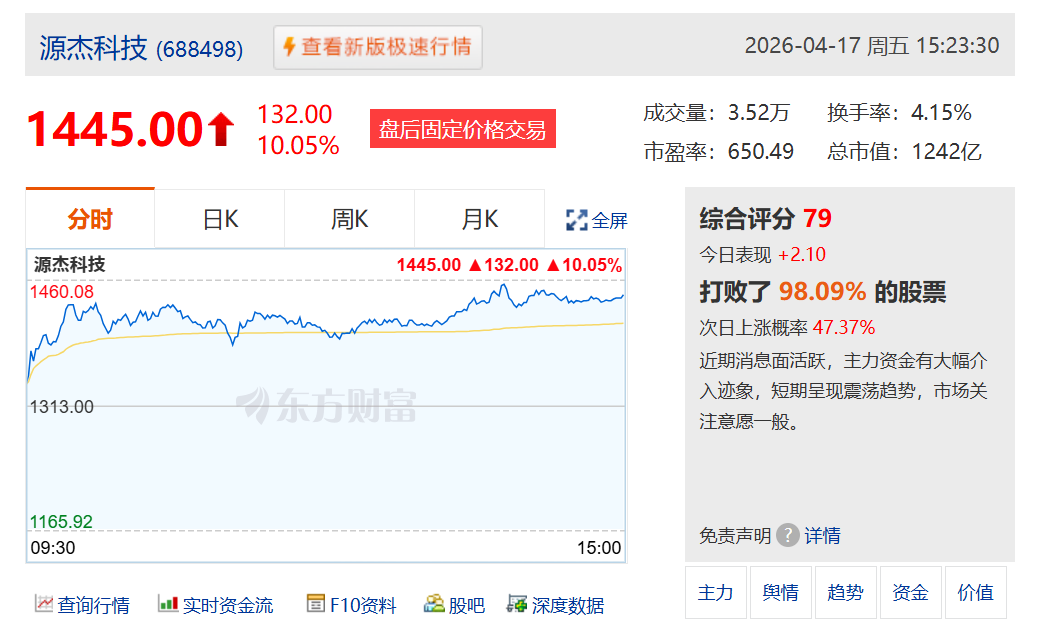值得一提的是,适度4月17日收盘,陕西源杰半导体科技股份有限公司报1445.00元/股,贵州茅台报1407.24元/股。源杰科技自此越过贵州茅台,成为A股股价最高的股票,即A股新“股王”。