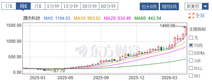 2025年4月9日盘中,源杰科技股价还仅为88.1元/股。旧年12月31日收盘价为641.99元/股,本年以来已高涨125%。