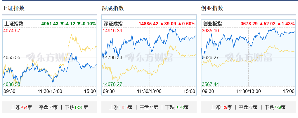 截止收盘,沪指跌0.1%,收报4051.43点;深证成指涨0.6%,收报14885.42点;创业板指涨1.43%,收报3678.29点。沪深京三市成交额达到24531亿,较昨日放量980亿。