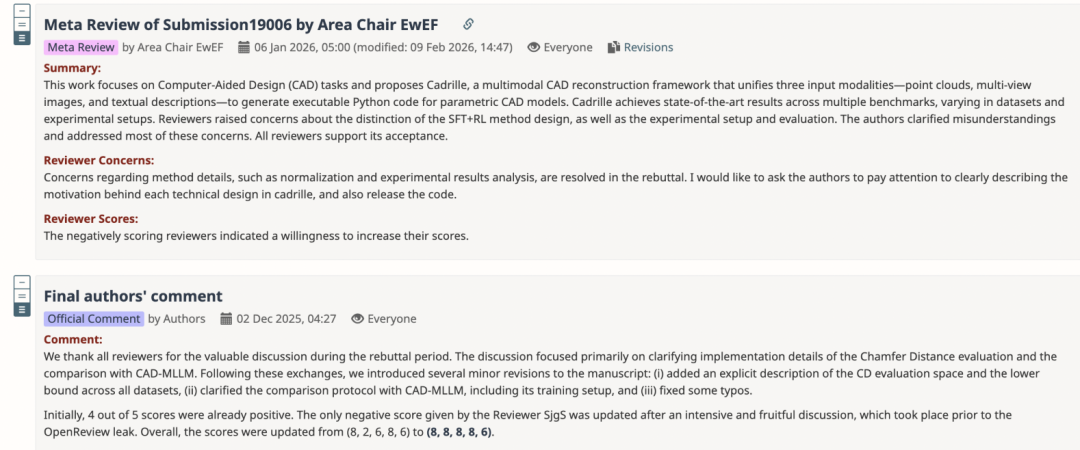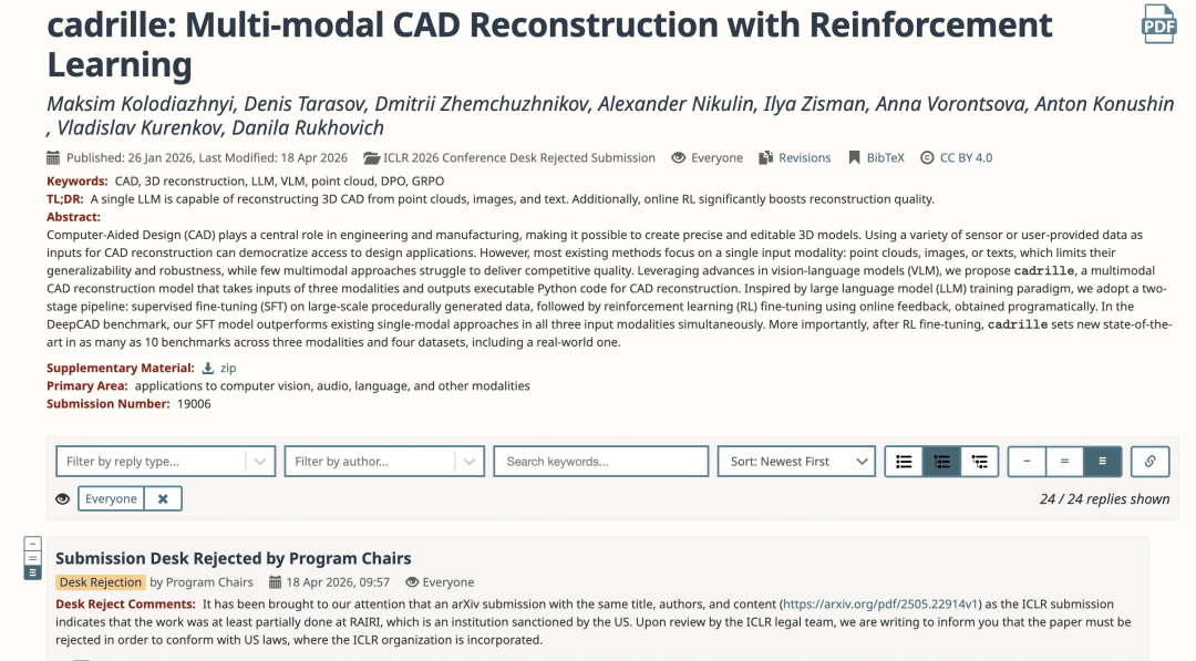 咱们去扒了下,这次被拒稿的论文为《cadrille: Multi-modal CAD Reconstruction with Reinforcement Learning》。