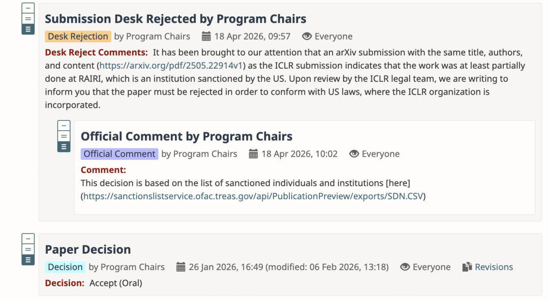 给出的原理是 RAIRI 是好意思国制裁的机构,ICLR 组织在好意思国注册,必须顺从好意思法则律,弗成接受来自被制裁机构的论文。
