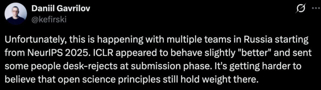 俄罗斯 AI 相干员 @kefirski 示意,从 NeurIPS 2025 驱动,俄罗斯的多个团队齐濒临着相同的问题。ICLR 的泄露似乎稍好一些,在提交阶段就径直拒却了一些东谈主的恳求。当今越来越难笃信绽放科学原则在这些顶会里还有什么重量了。